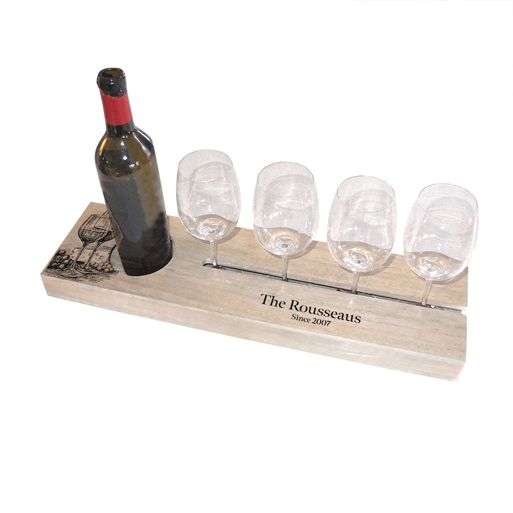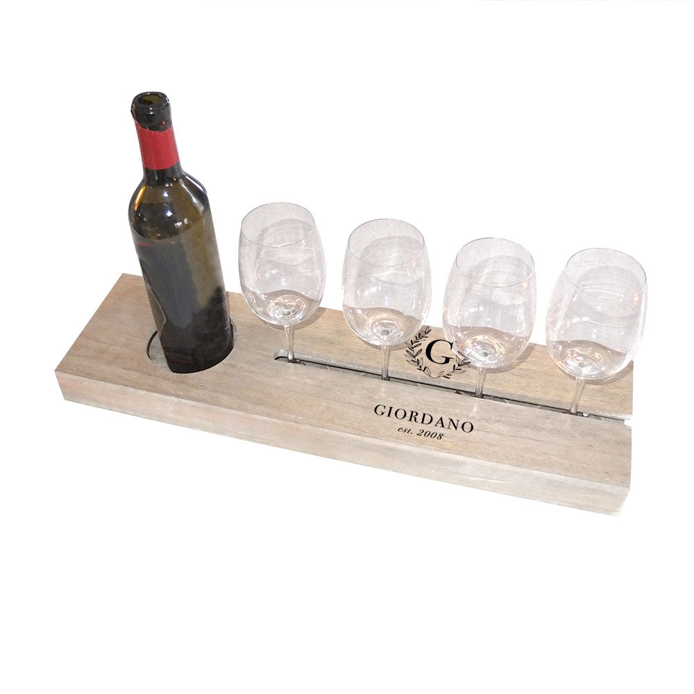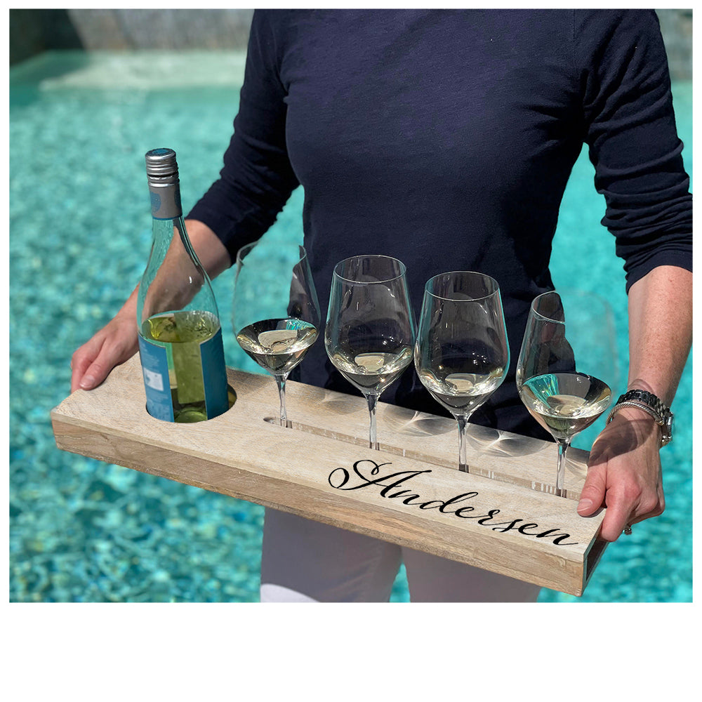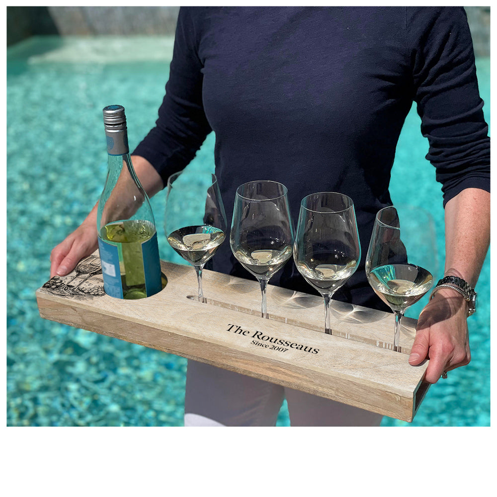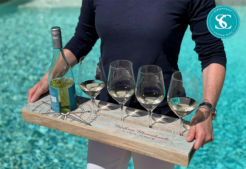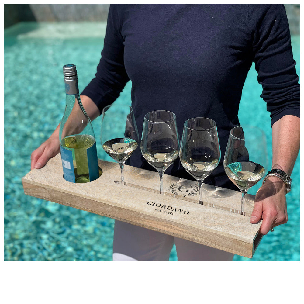 22x6x2. Custom crafted beverage server easily carries a standard 750mL bottle of wine and up to 4 stemmed glasses - or a classic martini shaker and garnished coupes! Glasses not included. Hand decorated in Rhode Island. All gifts are made to order and ship within 2-3 business days.