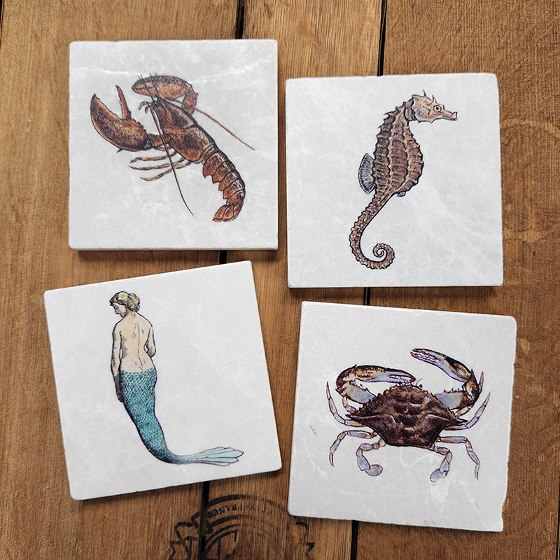 Classic sea creature coasters (mermaid, lobster, seahorse, crab).