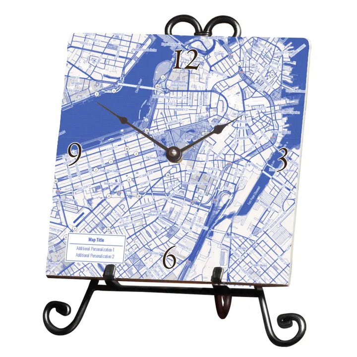 Desk Clock: 8" marble tile with AA-battery operated clock mechanism. Custom cast-iron display easel available.