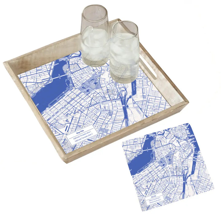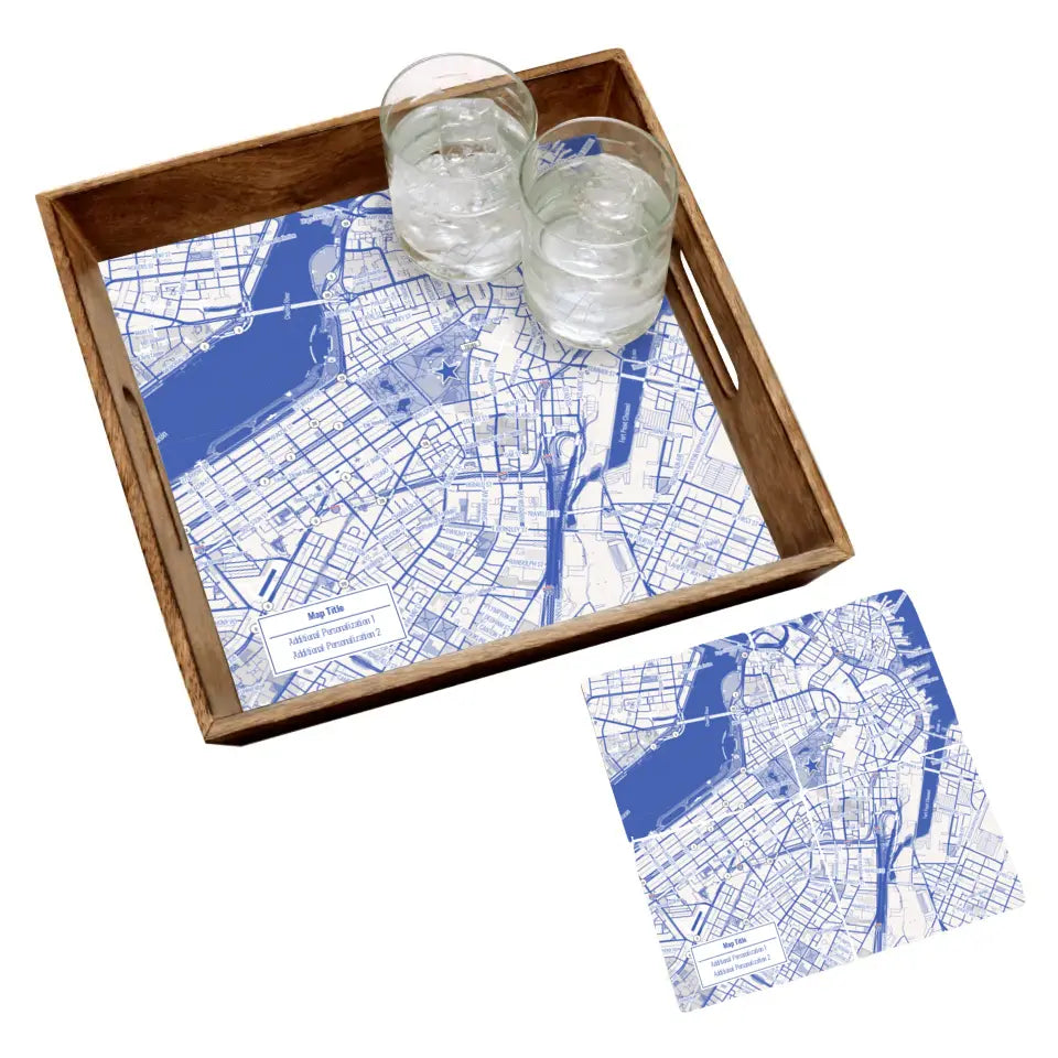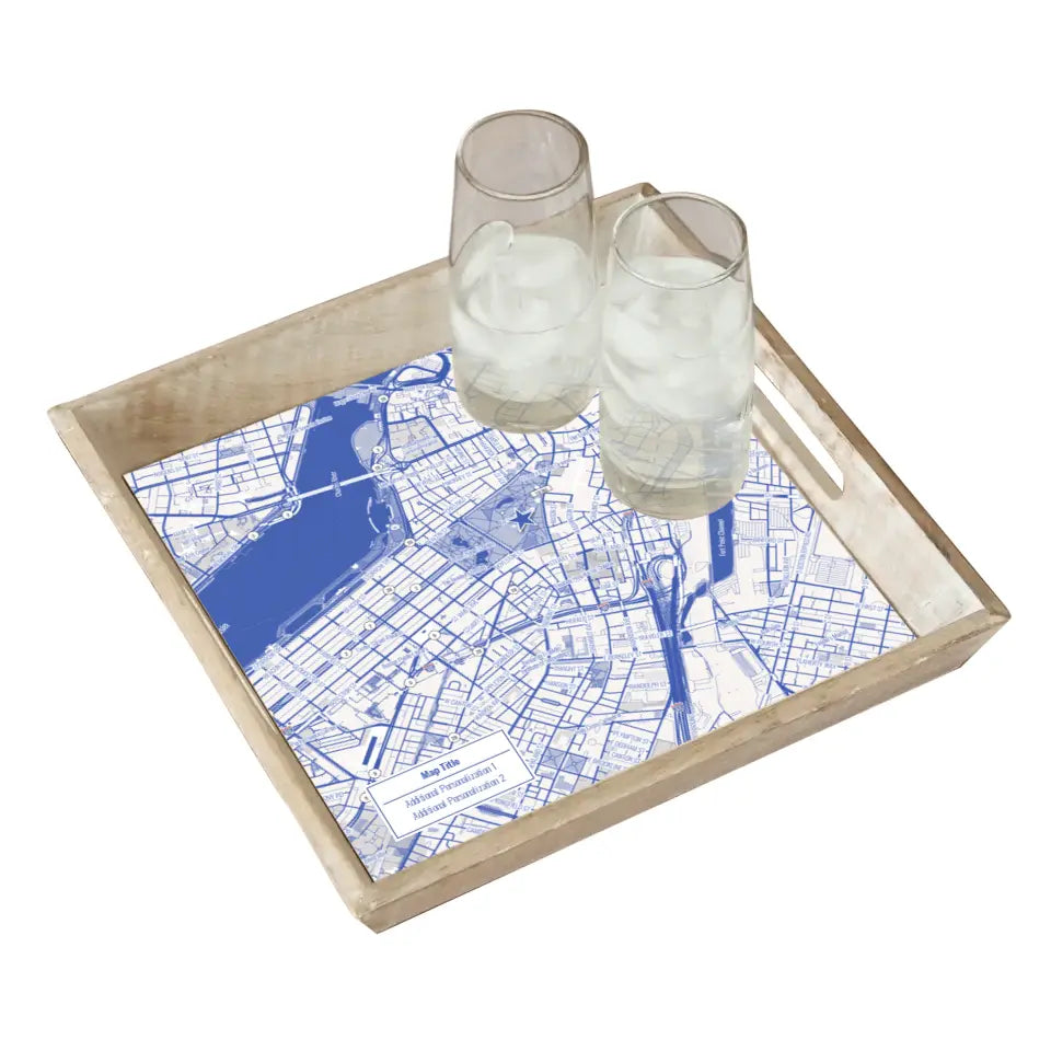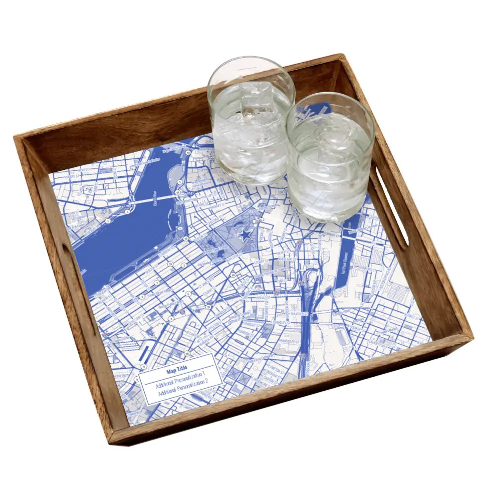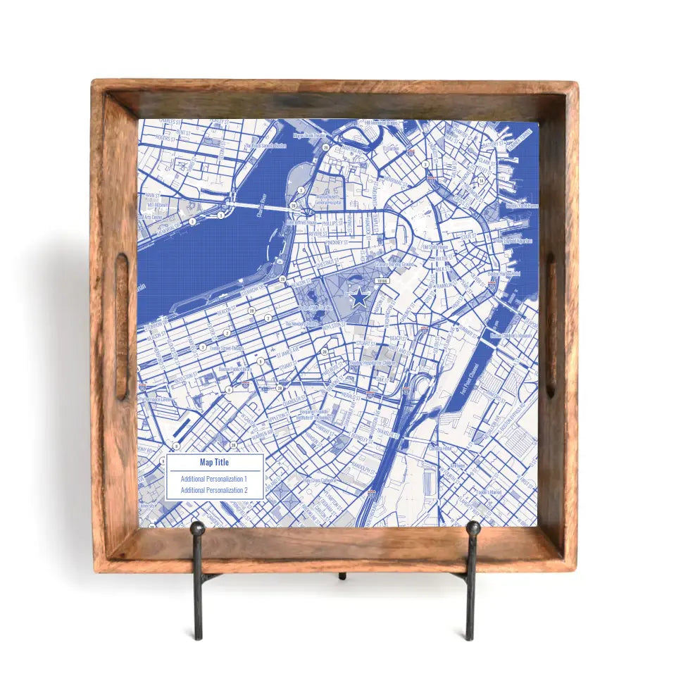 Wood Serving Tray: 14" square, burnt mango wood serving tray is decorated and assembled in Rhode Island, USA from the best available components world-wide.