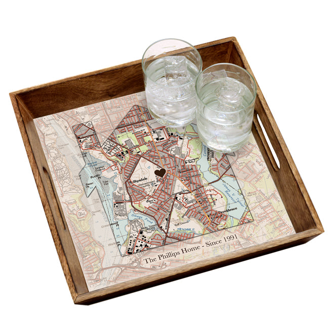 Product Details: 14" square wood tray made of mango wood comes in either white-washed natural light wood or a dark burnt wood. The serving tray is decorated and assembled in Rhode Island, USA from the best available components world-wide.
