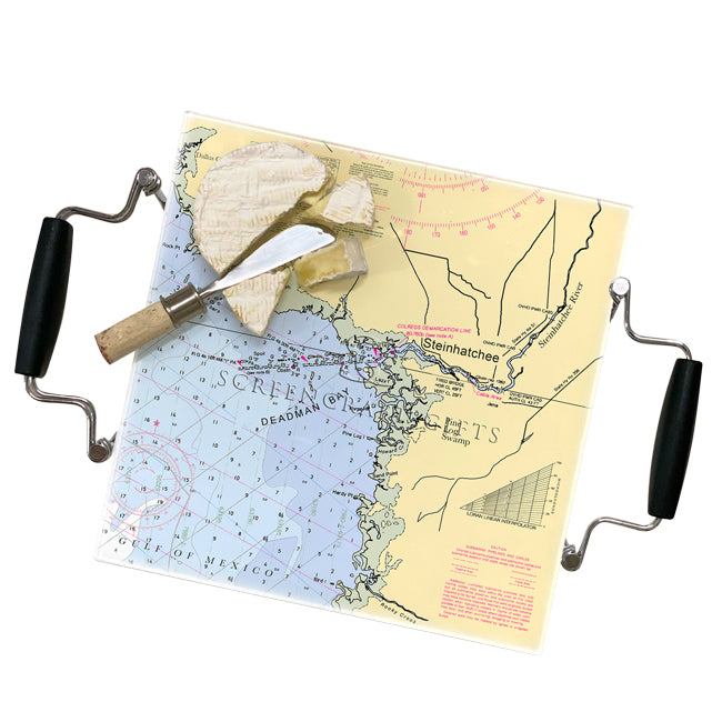 12" tempered glass perfect for preparation and entertaining.  Use as a cutting board and a serving tray. Rubber feet to grip surfaces. Not Dishwasher safe. Rubber feet to grip surfaces.