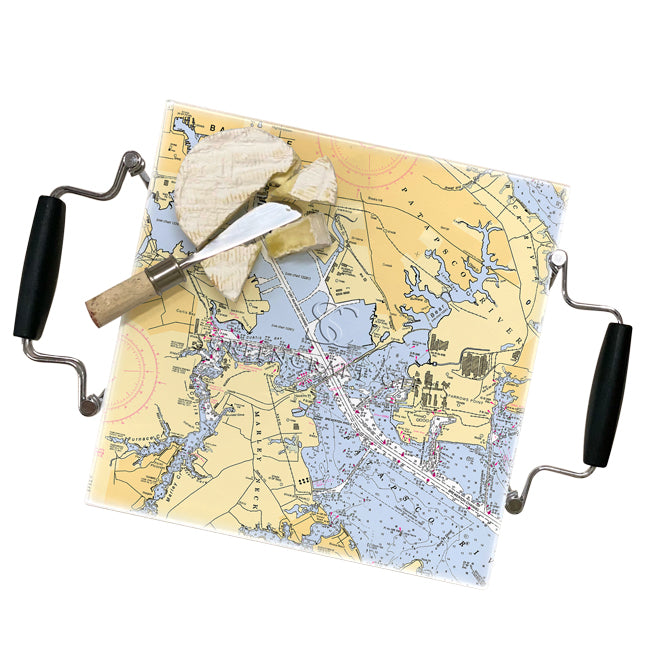 12" tempered glass perfect for preparation and entertaining.  Use as a cutting board and a serving tray. Rubber feet to grip surfaces. Not Dishwasher safe. Rubber feet to grip surfaces.