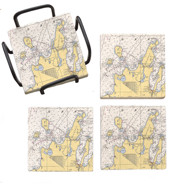 Coaster Set: Four 4" cork-backed coasters with identical images on each coaster.